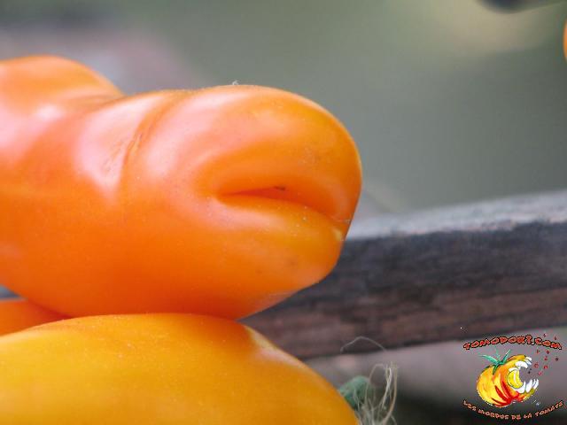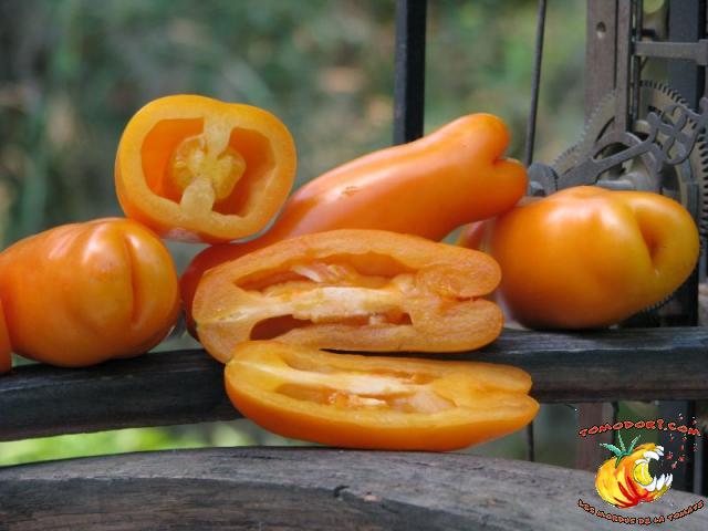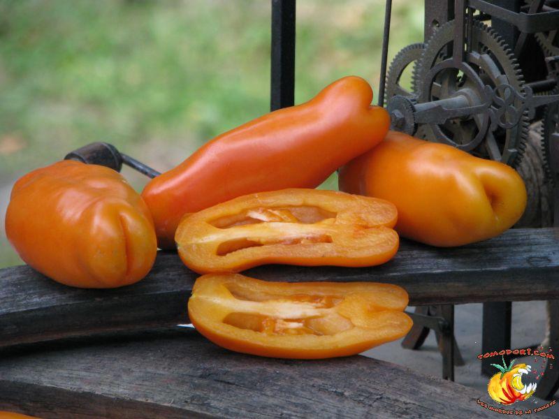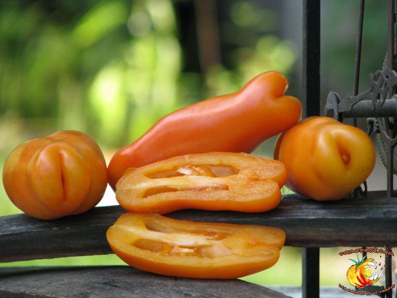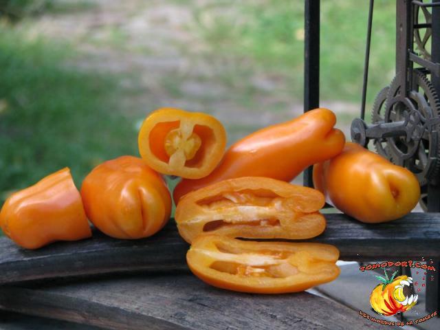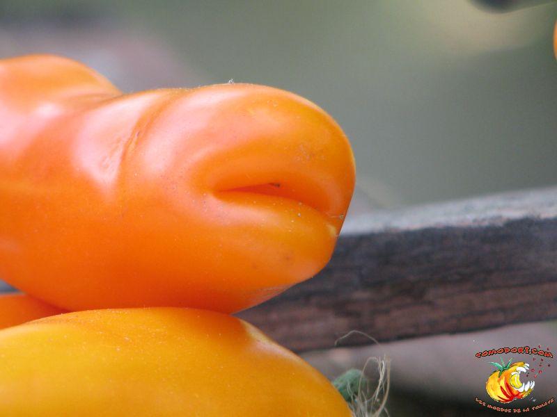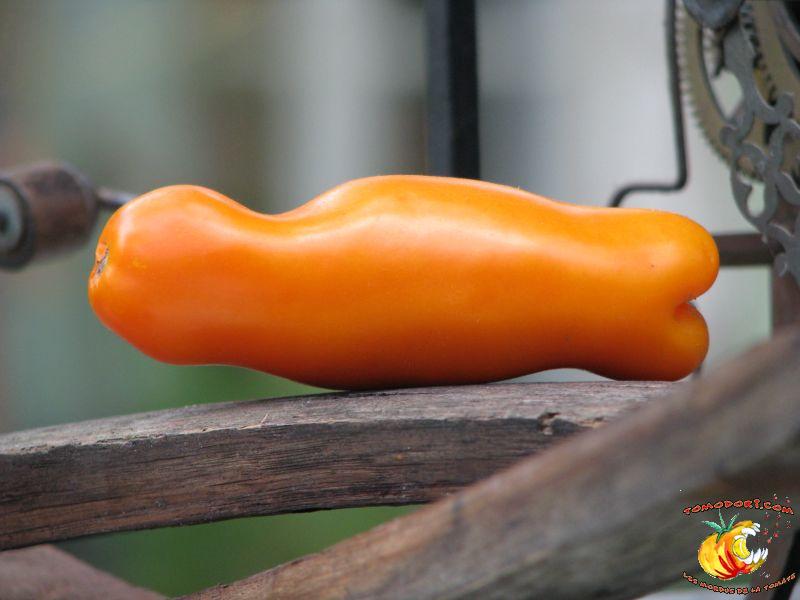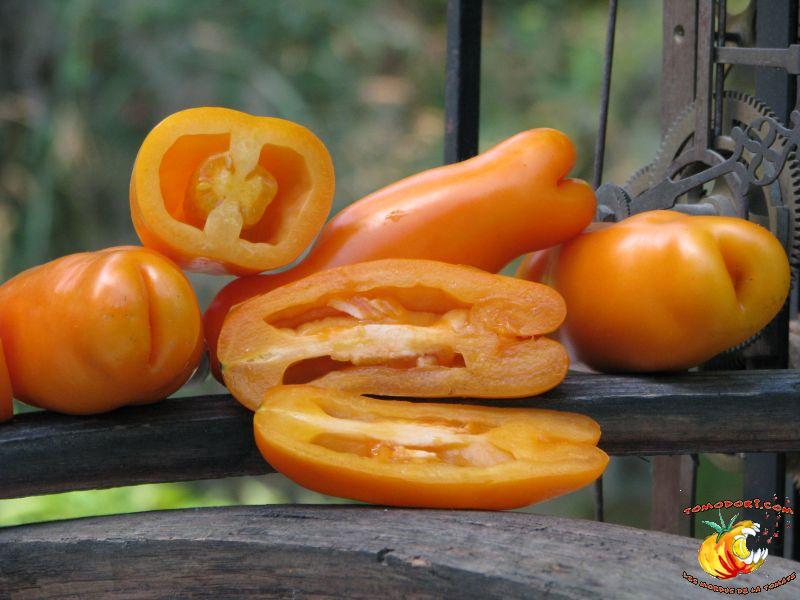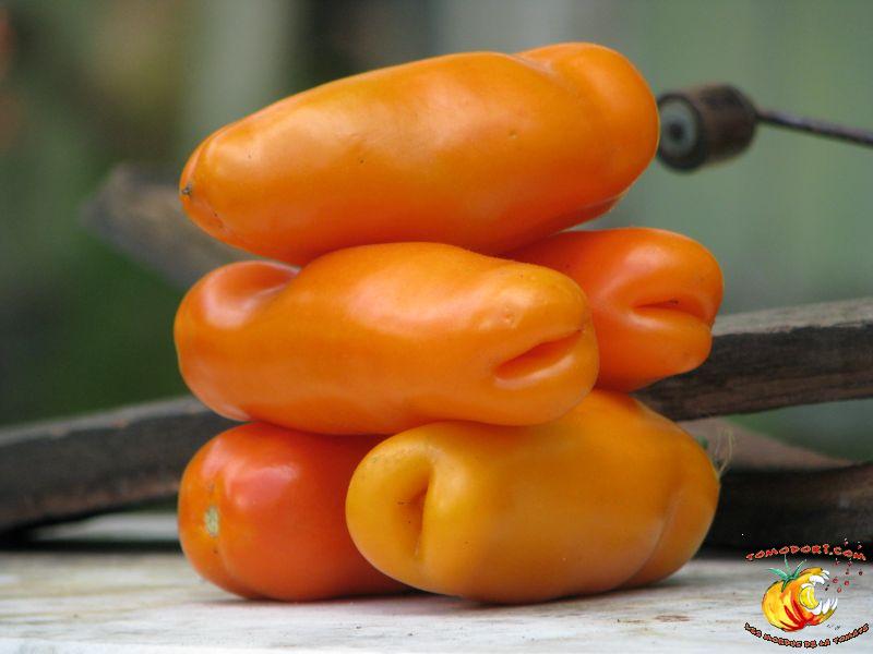 Très belle variété de tomates allongées, orange. Fruit assez creux, sans jus, mais assez charnu : idéal pour faire sécher. Plant très productif à croissance indéterminée, produisant des grappes de 5 à 10 tomates. Variété assez tardive, à feuillage normal. Allez vers la fiche de cette variété