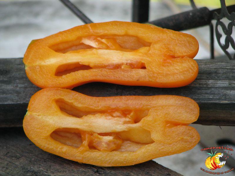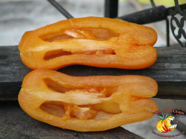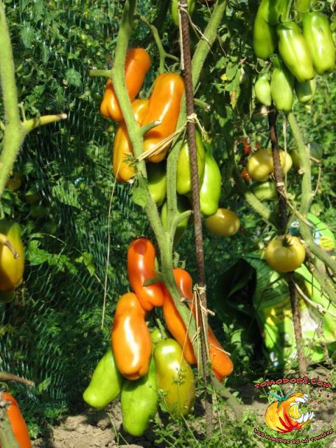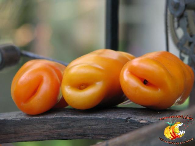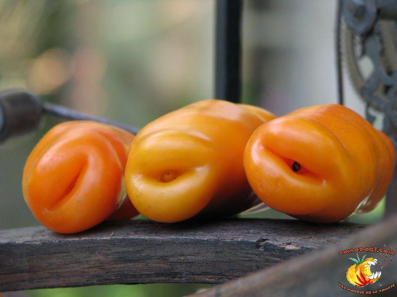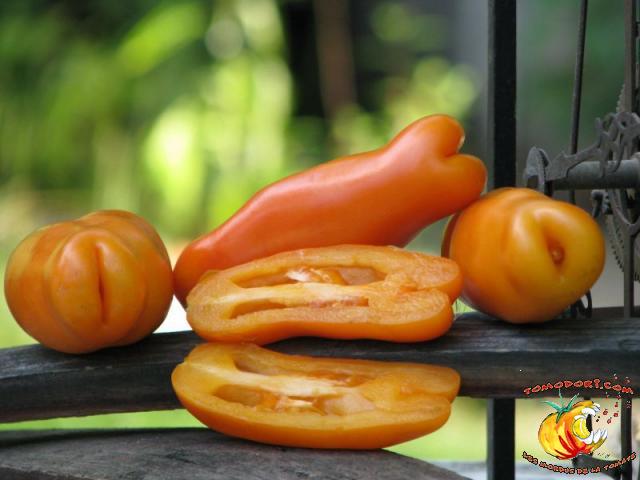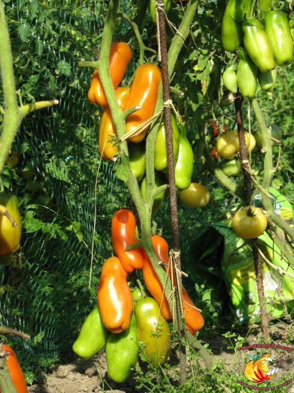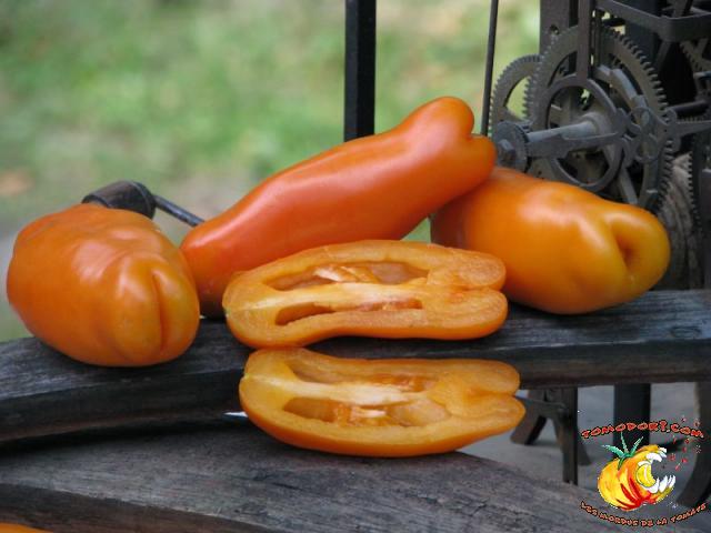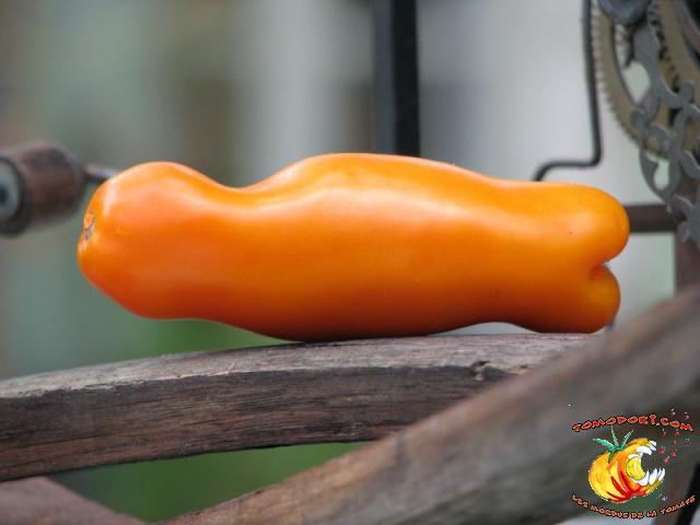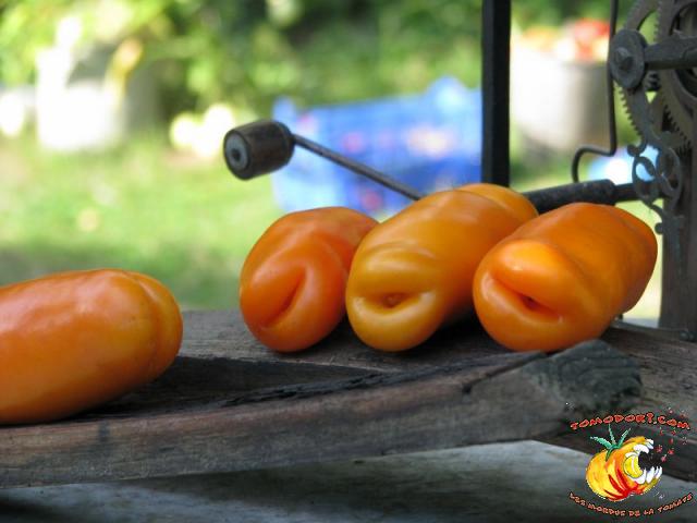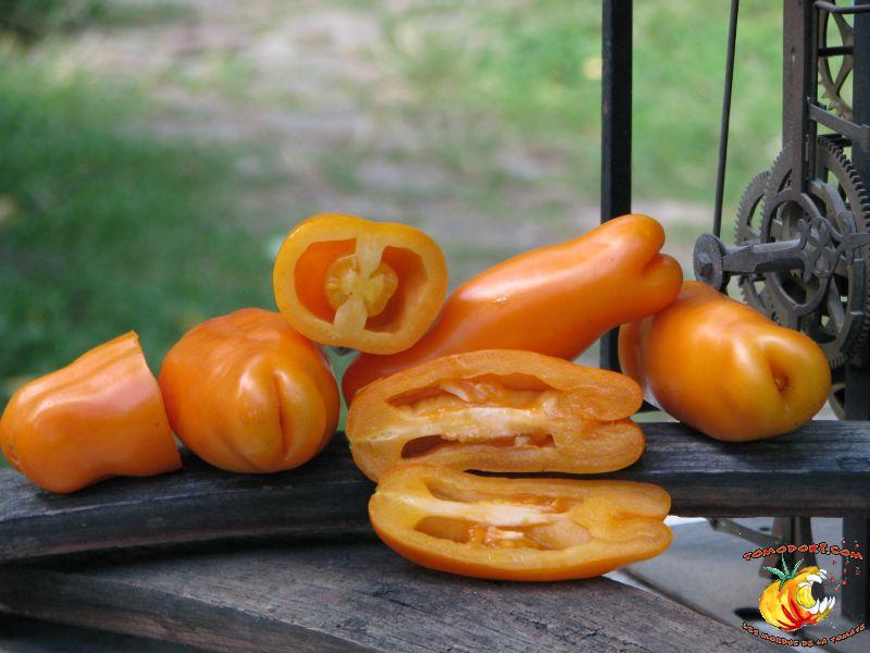 Très belle variété de tomates allongées, orange. Fruit assez creux, sans jus, mais assez charnu : idéal pour faire sécher. Plant très productif à croissance indéterminée, produisant des grappes de 5 à 10 tomates. Variété assez tardive, à feuillage normal. Allez vers la fiche de cette variété