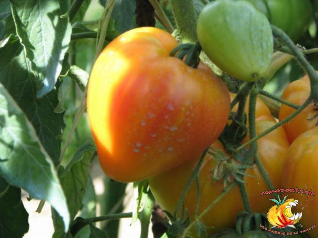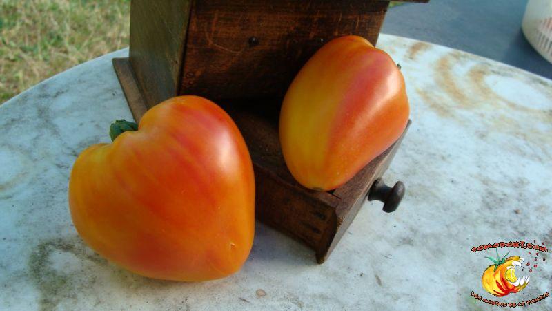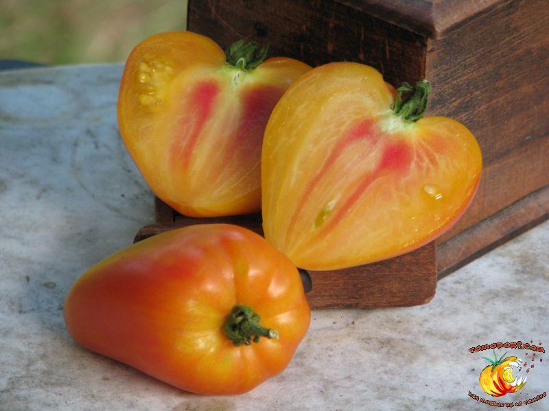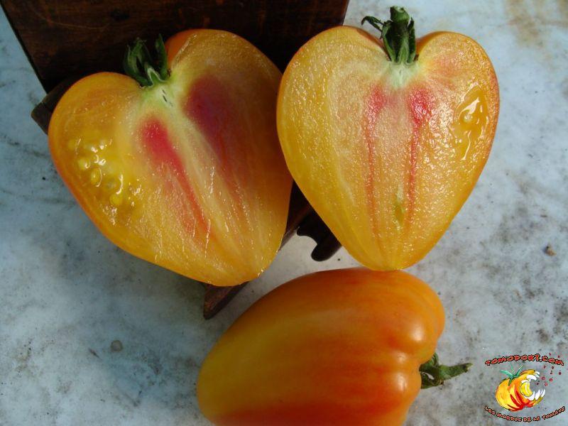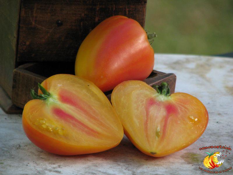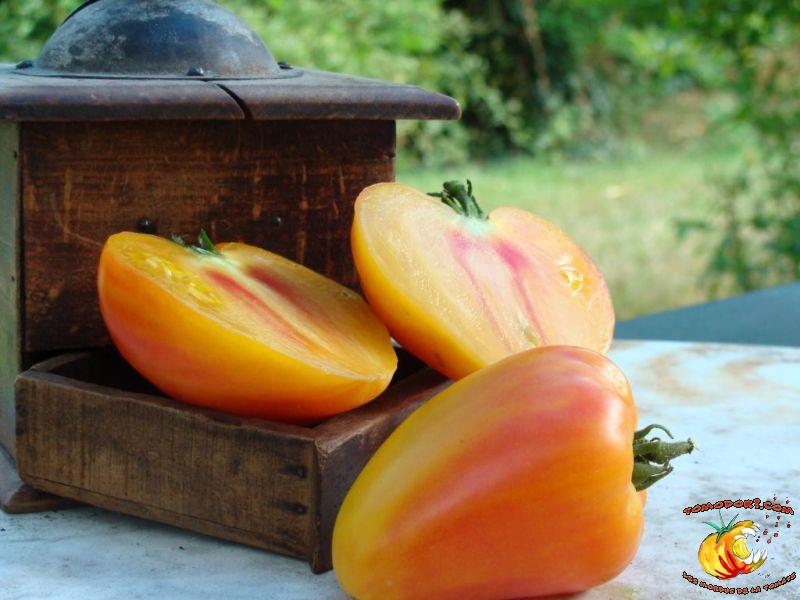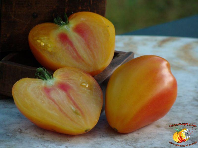 Tomate Orange Russian Date : 23/04/2009 Tomate jaune orangée marbrée de rose-rouge. Chair ferme et superbe. Tomate de saveur excellente, plutôt douce, pas de saveur "rentre-dedans". Croissance indéterminée, feuillage normal.