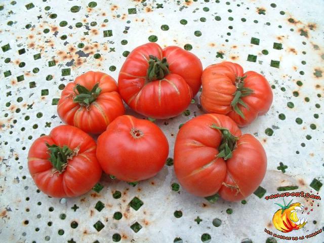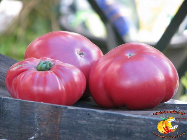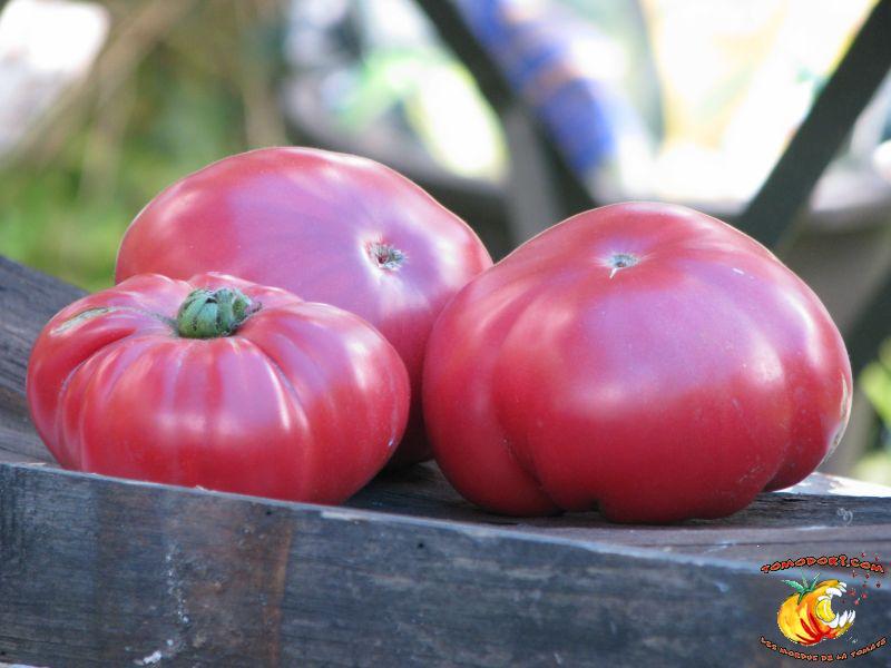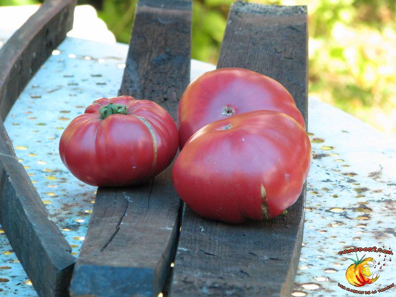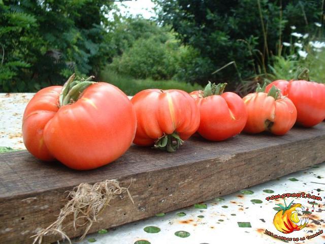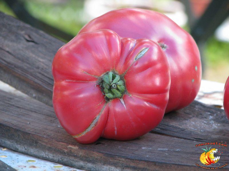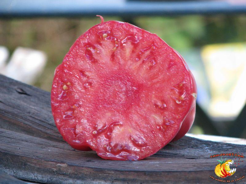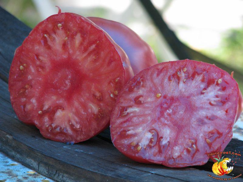 Elle est parfaitement délicieuse cette tomate... Très belle couleur rose, sucrée comme un vrai bonbon, même pas besoin de l'assaisonner...Fruits de type chair de boeuf, assez gros. Variété tardive (85 jours). Croissance indéterminée. Hauteur : 1,80 m. Feuillage de pomme de terre. Origine : Moldavie. Allez vers la fiche de cette variété