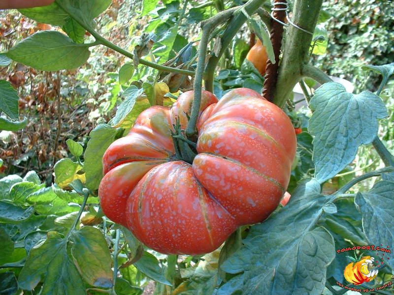 Très grosses tomates, en forme de potiron, légèrement côtelée. Chair dense, riche et goût prononcé de tomate. Idéale pour de belles salades ou pour farcir. Croissance indéterminée. Feuillage normal. Allez vers la fiche de cette variété