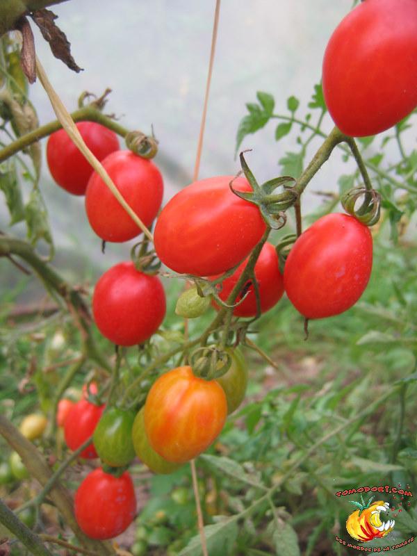 Nombreuses tomates de taille cocktail en forme de prunes allongées.