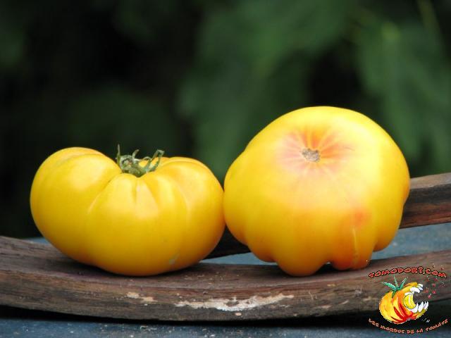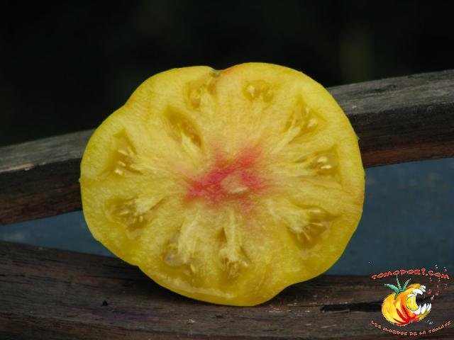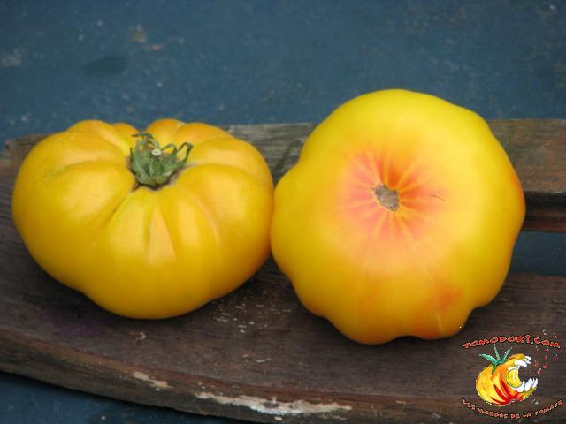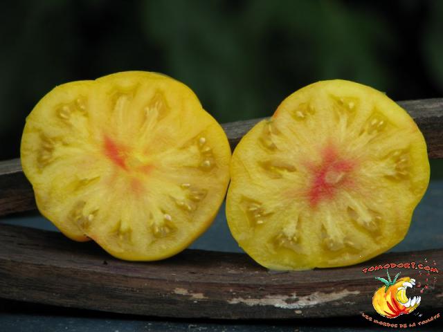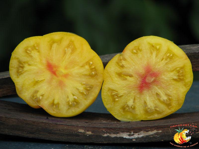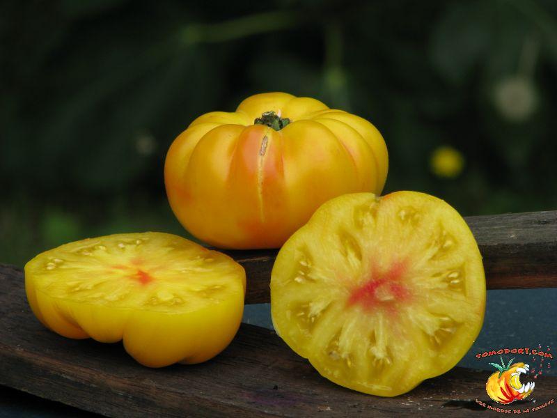 Tomates à la saveur excellente et délicate. Couleur exceptionnelle : le jaune tire sur le rose au centre du fruit. Croissance indéterminée. Feuillage normal. Variété ancienne originaire de West Virginia, USA, issue de la variété Henderson's Ponderosa Beefsteak, en 1914. Allez vers la fiche de cette variété