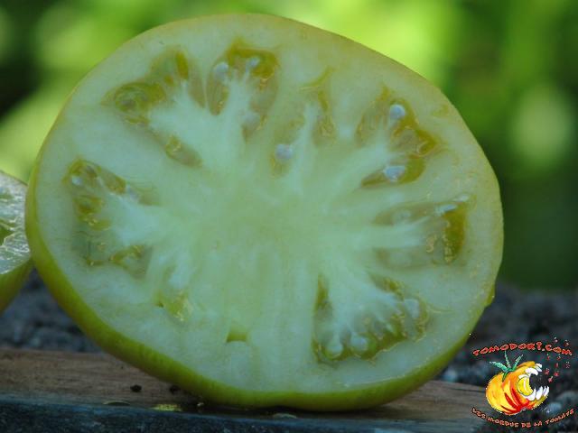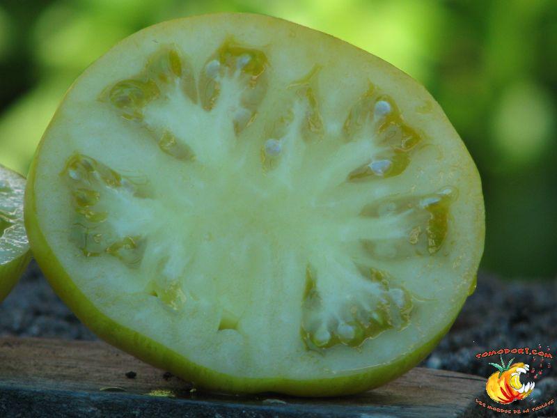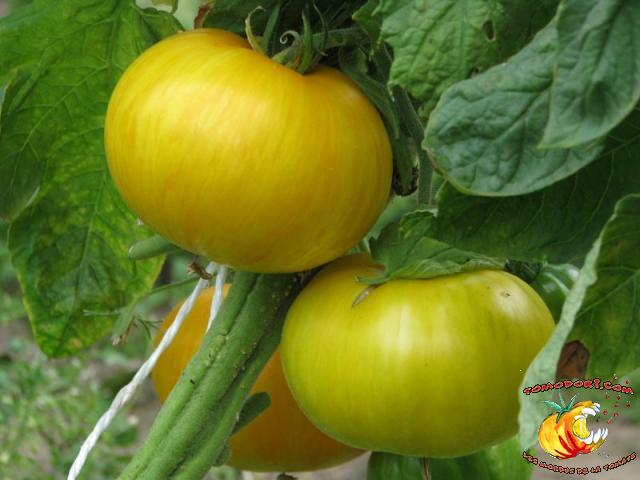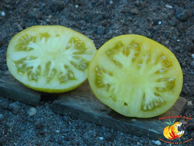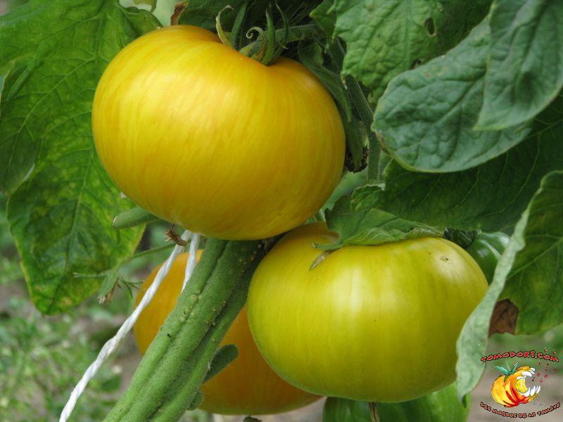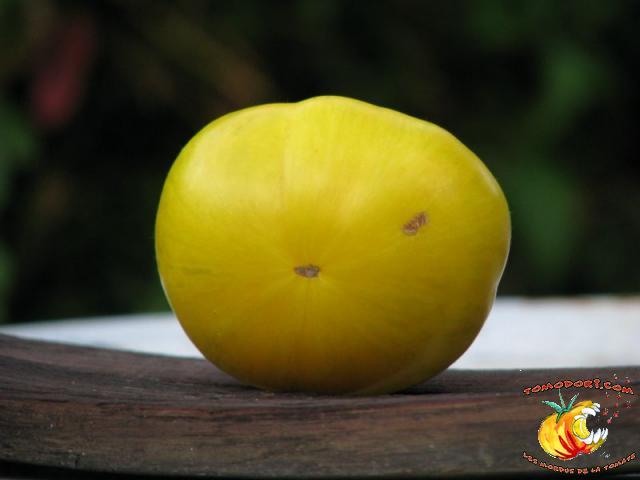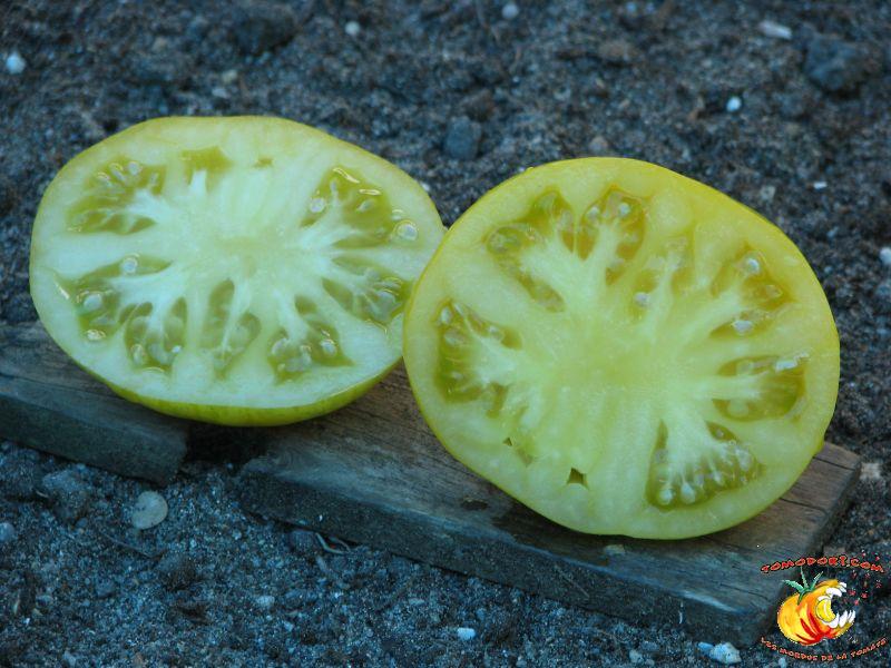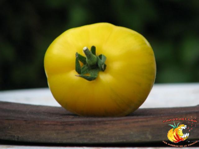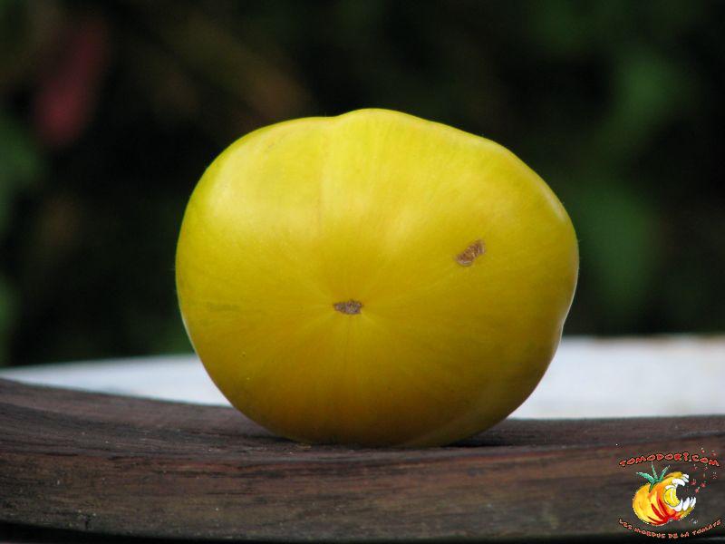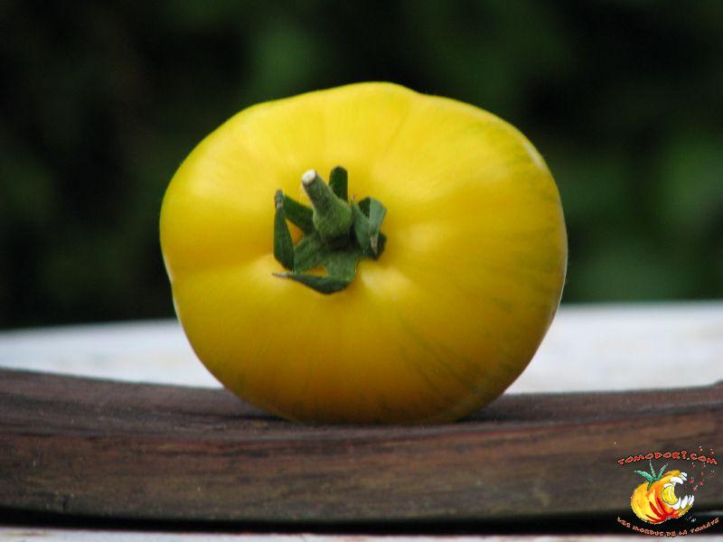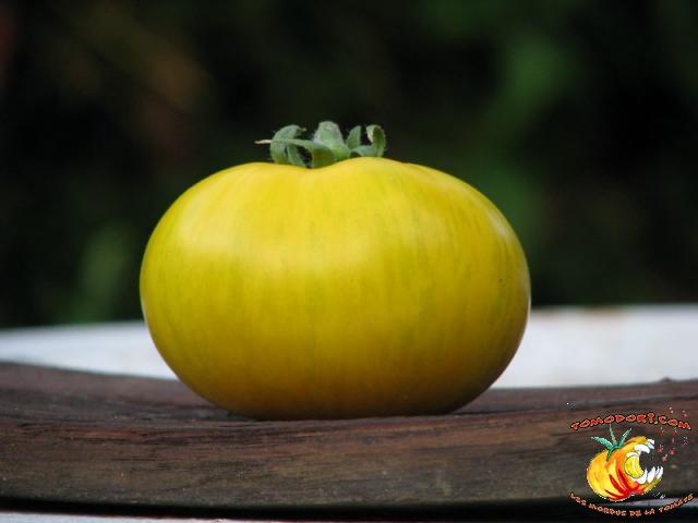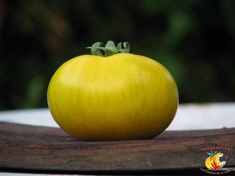 Tomate Big Yellow Zebra Date : 04/04/2009 Une très belle tomate, grosse, charnue, régulière, jaune, délicatement striée de vert. La chair est bien jaune, de bonne qualité gustative. Plant bien vigoureux, productif. Variété de saison, presque précoce. Croissance indéterminée. Variété originaire des USA, créée par Brad Gates de Wild Boar Farms.
