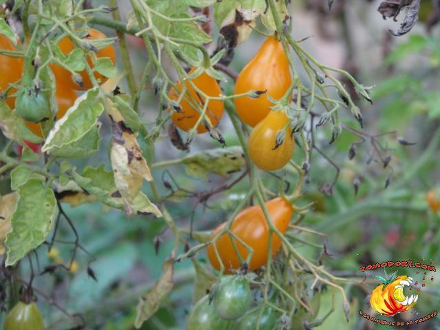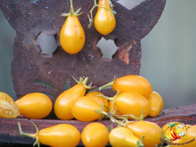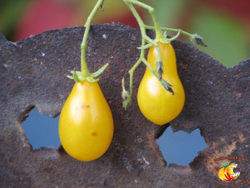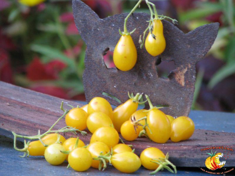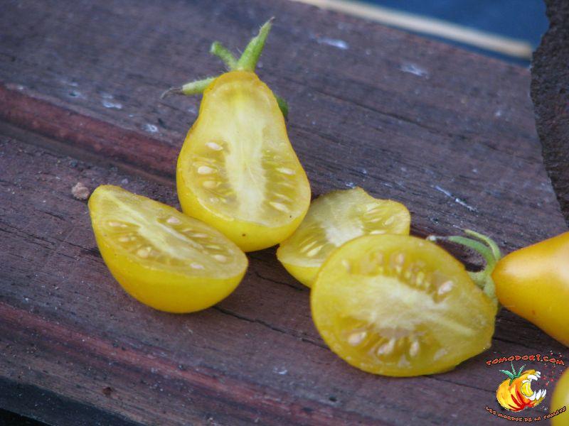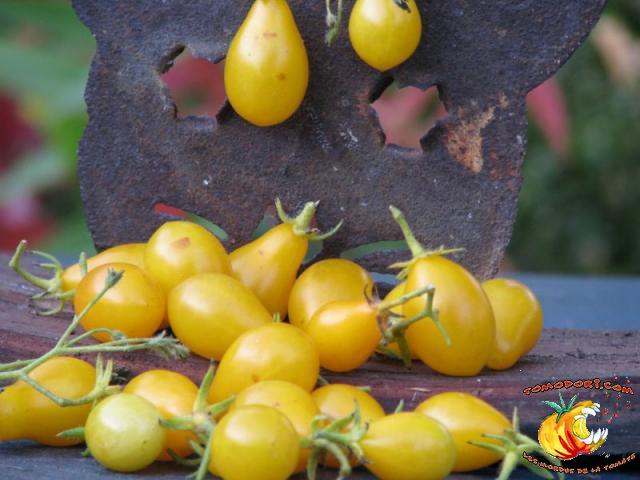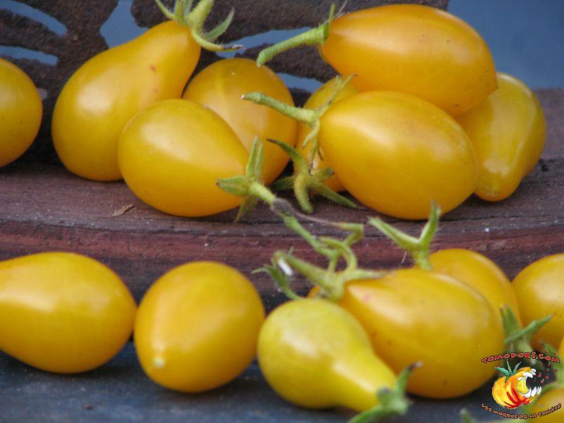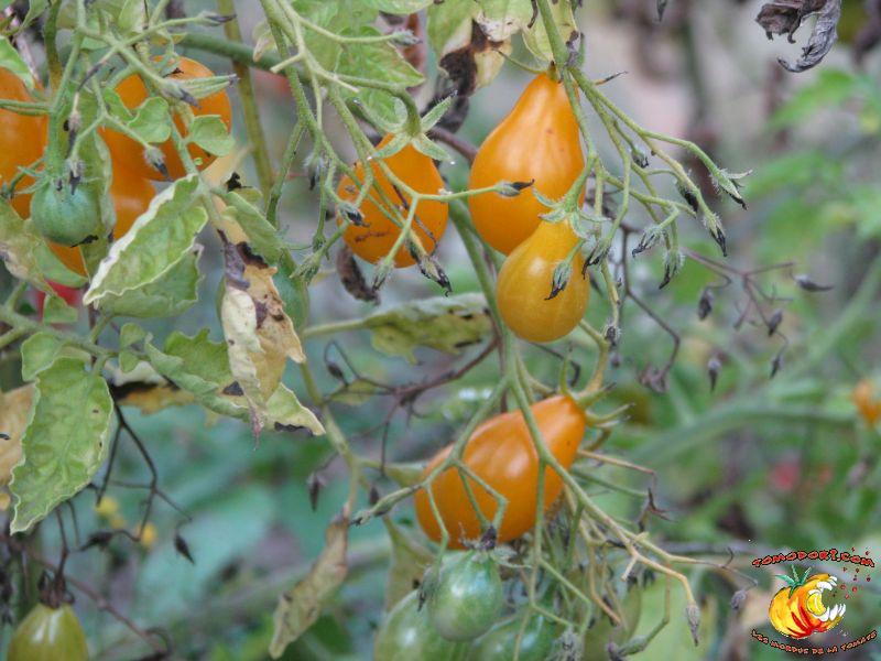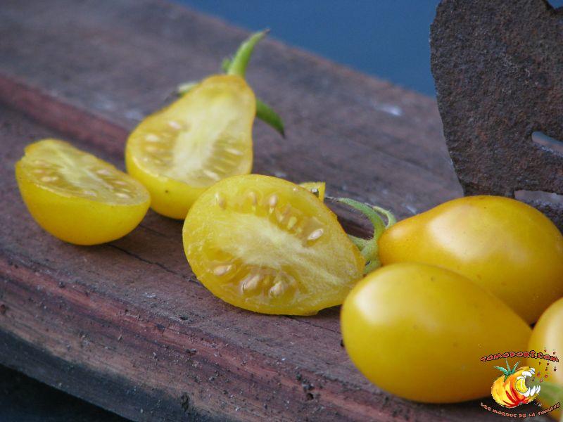 Variété très productive de nombreuses petites tomates jaunes en forme de poire ou de goutte d'eau. Les fruits sont groupés en grappes très fournies et ramifiées. Bonne saveur, sucrée. Proche de Gelb Dettilwein. Plant à croissance indéterminée, mais parfois l'abondance de grappes freine la croissance en hauteur du plant. Feuillage normal, pas très développé. Variété de saison, voire tardive. Allez vers la fiche de cette variété