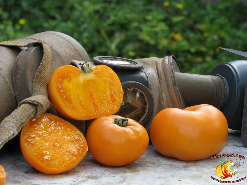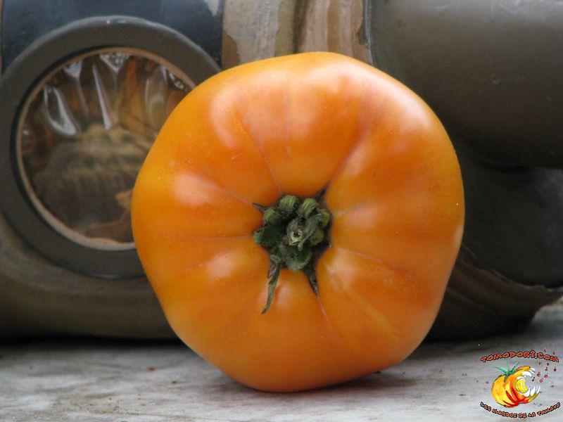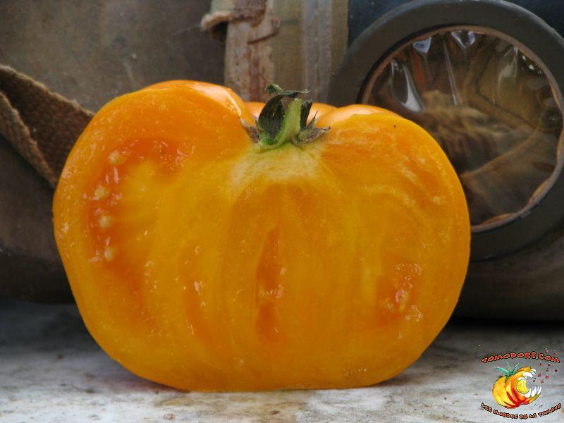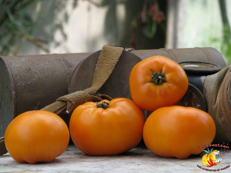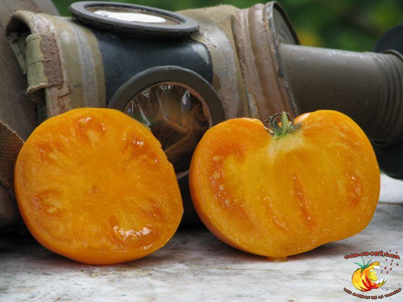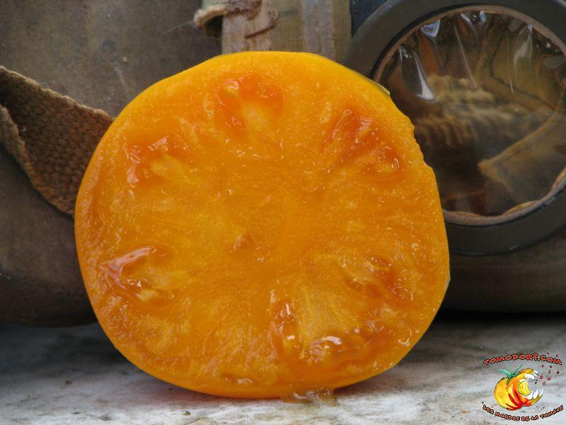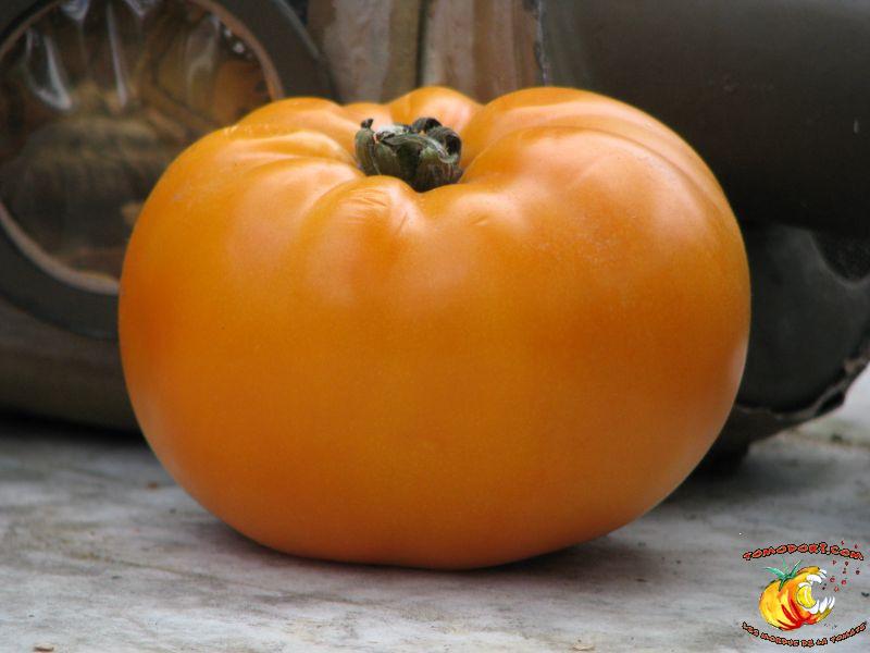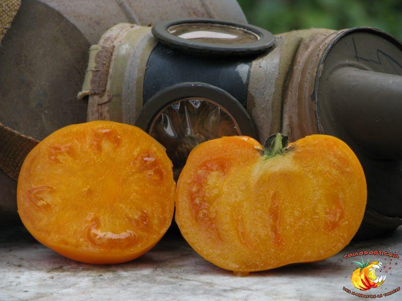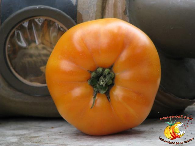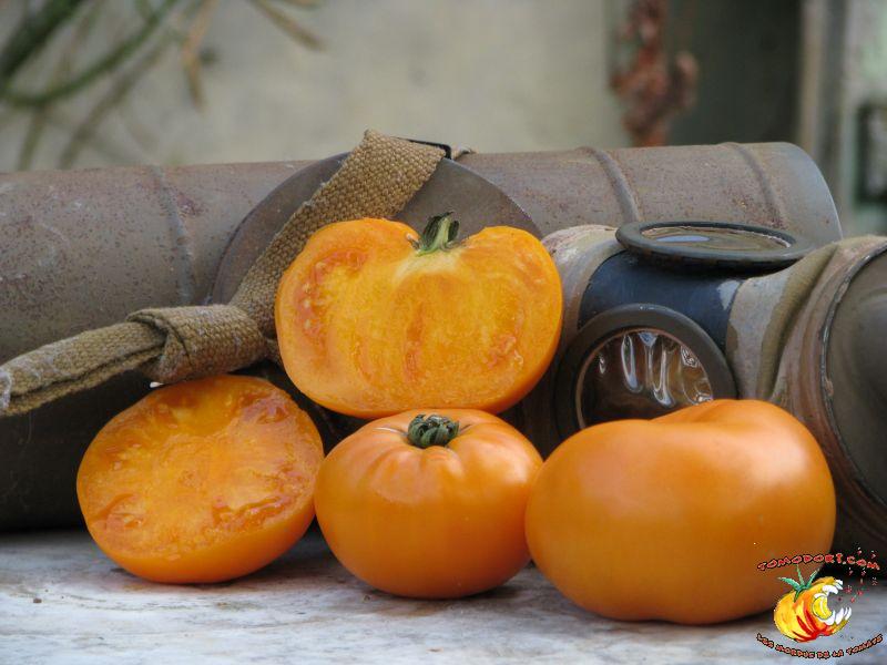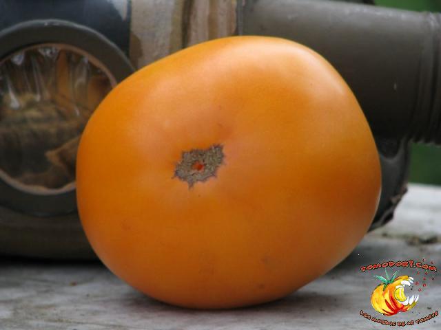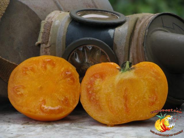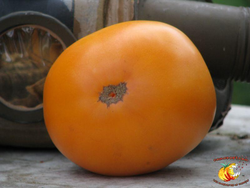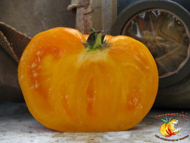 Gros fruits orange doré, de couleur inhabituelle, charnus atteignant le kilo. Chair ferme avec peu de graines. Goût particulier, doux et sucré. Légèrement épicé. Variété de saison à tardive, à croissance indéterminée. Hauteur : 2 m. Feuillage normal. Origine : Russie. Allez vers la fiche de cette variété