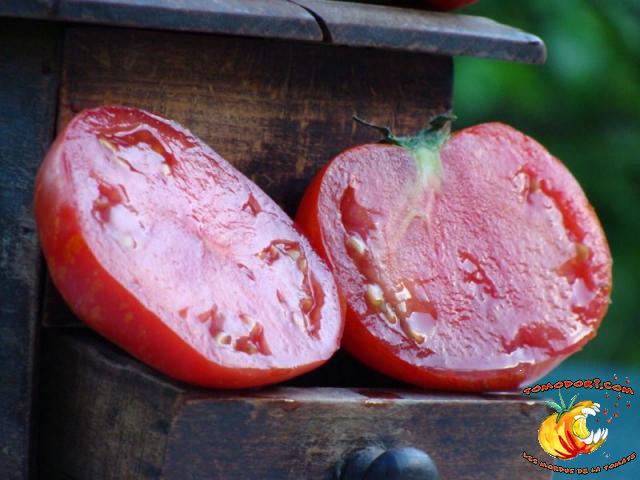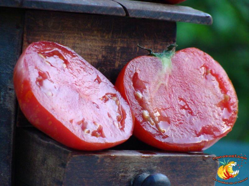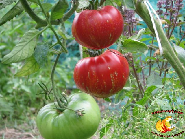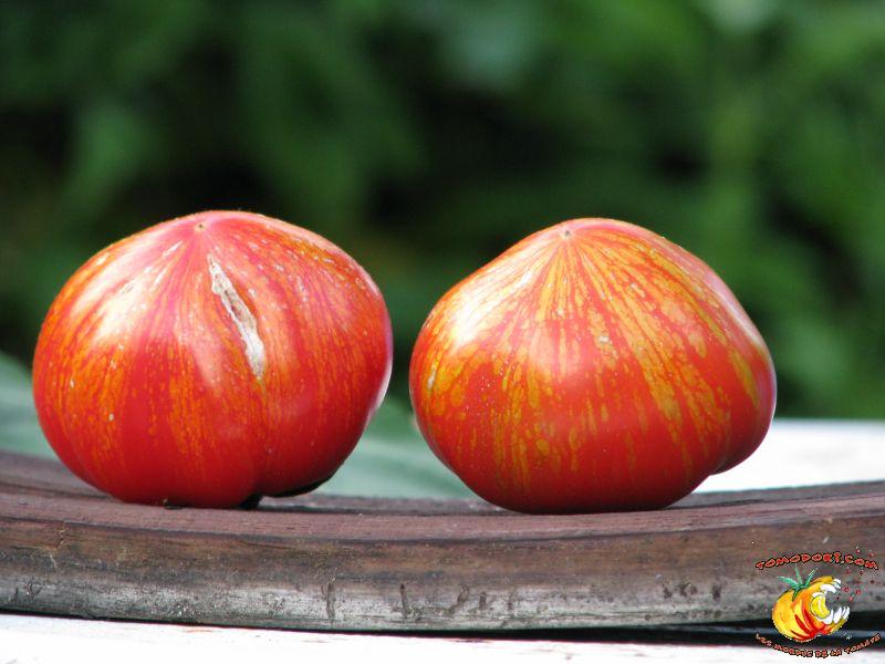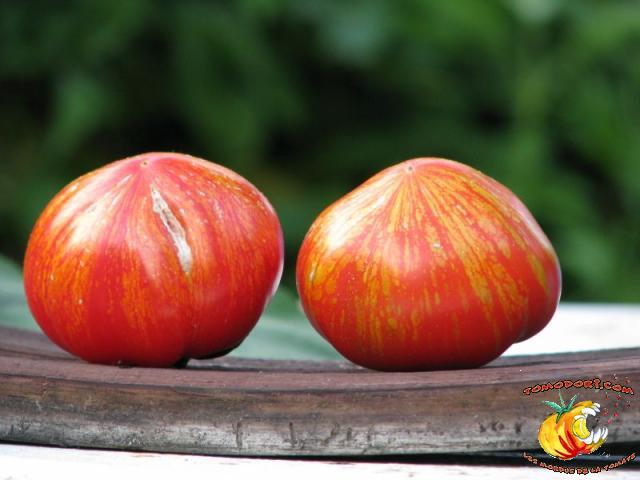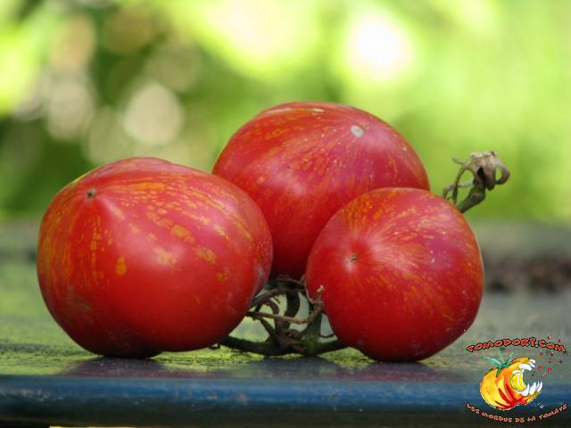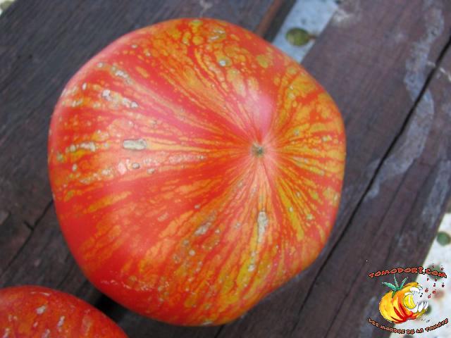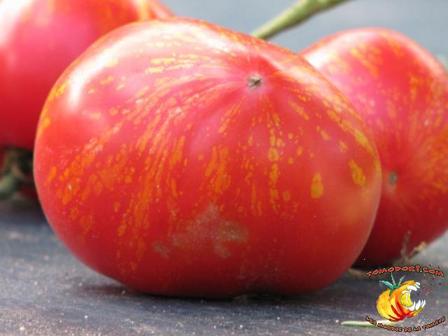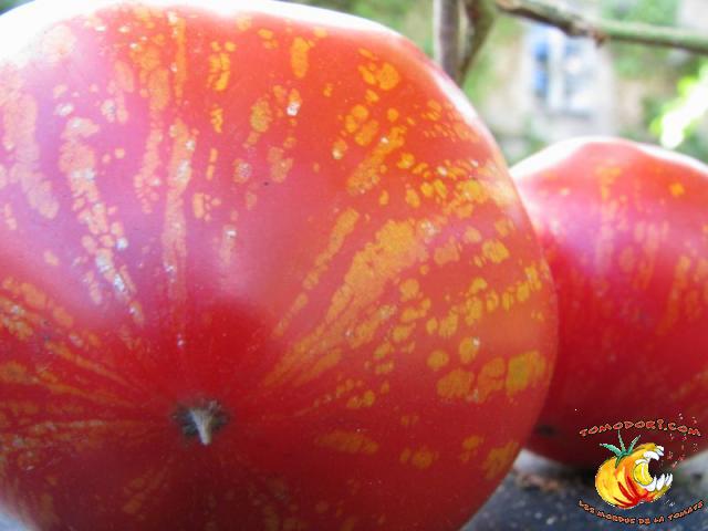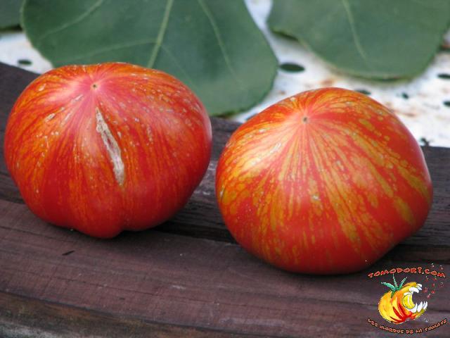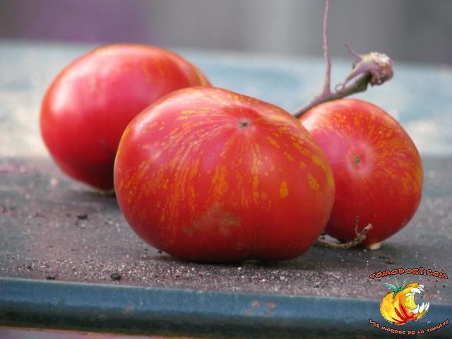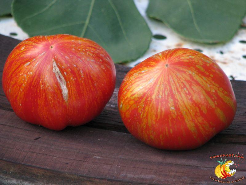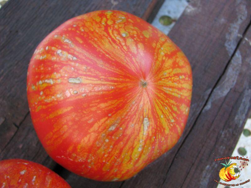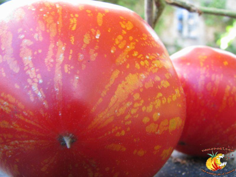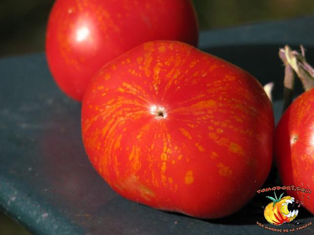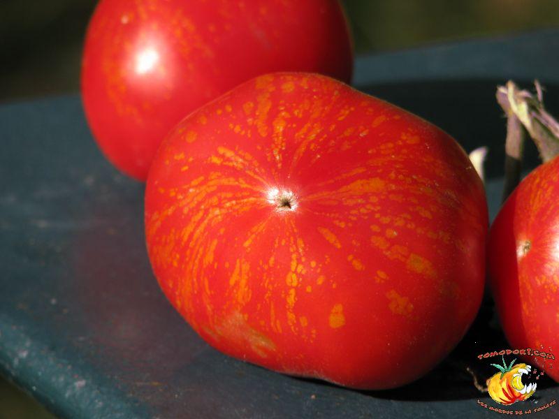 Tomate spectaculaire par sa couleur rouge éclaboussée de rayures irrégulières dorées. Son nom est évocateur. Fruit charnus, assez denses. Saveur prononcée de bonne tomate. Variété précoce, de croissance indéterminée à feuillage normal. Allez vers la fiche de cette variété