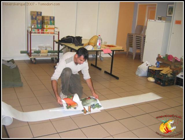 Préparation de la banderole Tomodori au petit matin