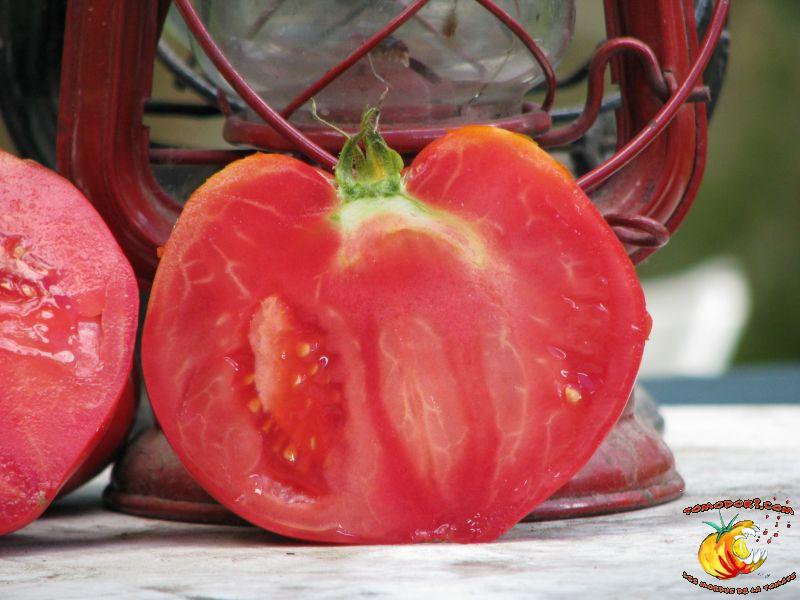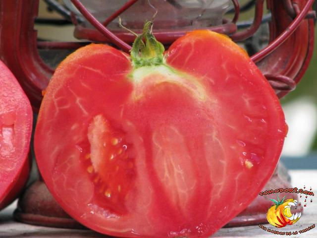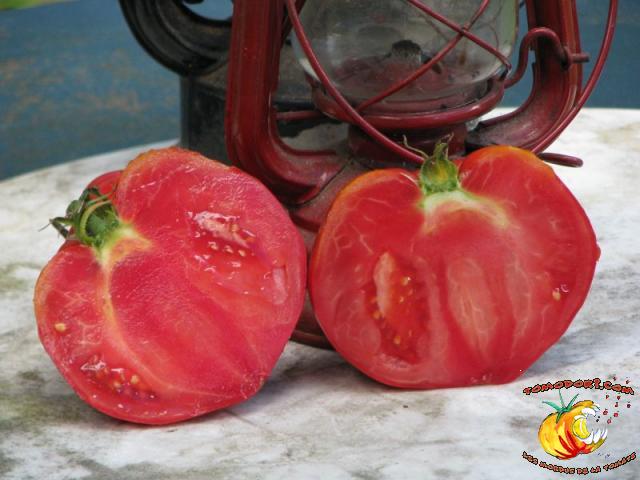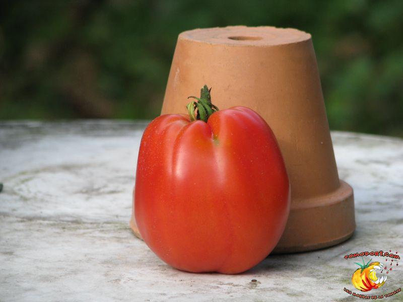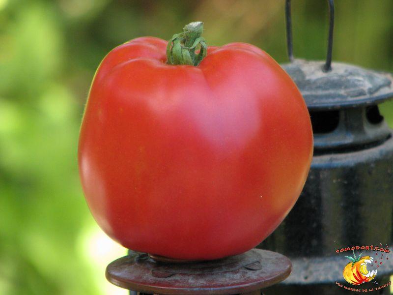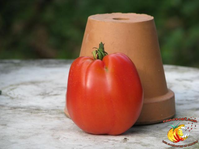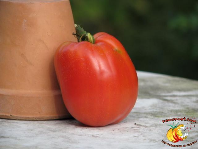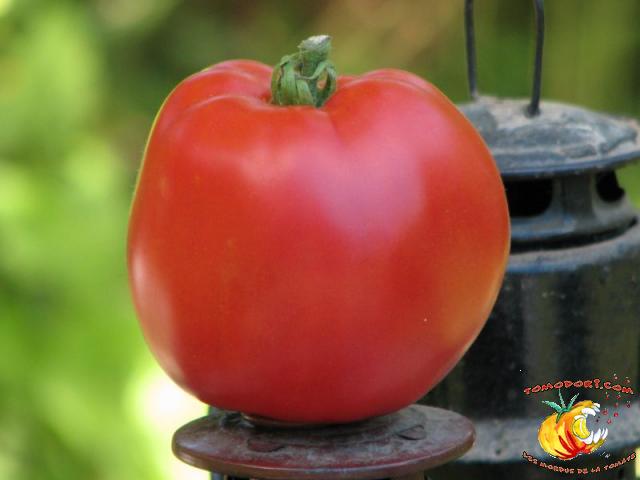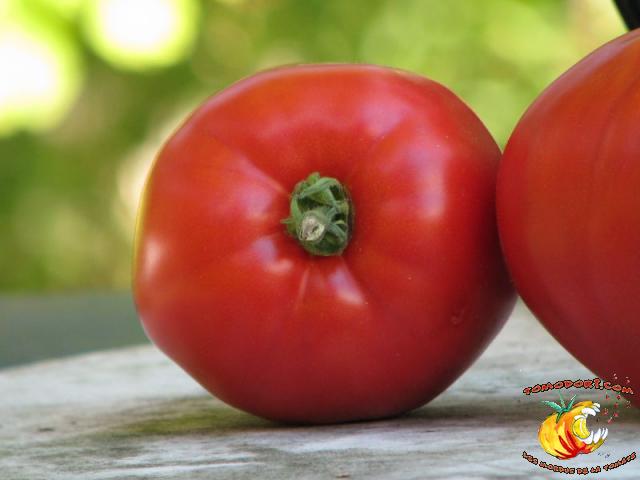 Belle tomate de type cœur de bœuf, d'un beau rouge. Un peu de vert au collet. Fruit très charnu à la bonne saveur de tomate. Idéale pour les coulis. Variété à croissance indéterminée, de saison, à feuilles normales. Vient d'Australie. Allez vers la fiche de cette variété